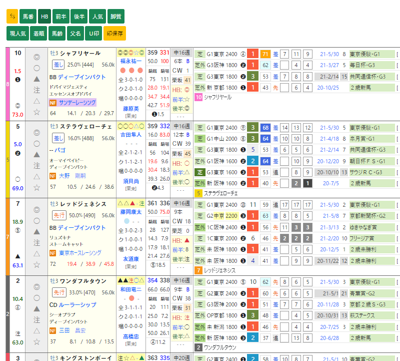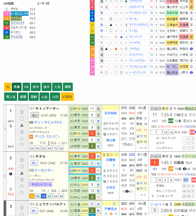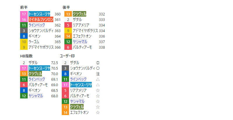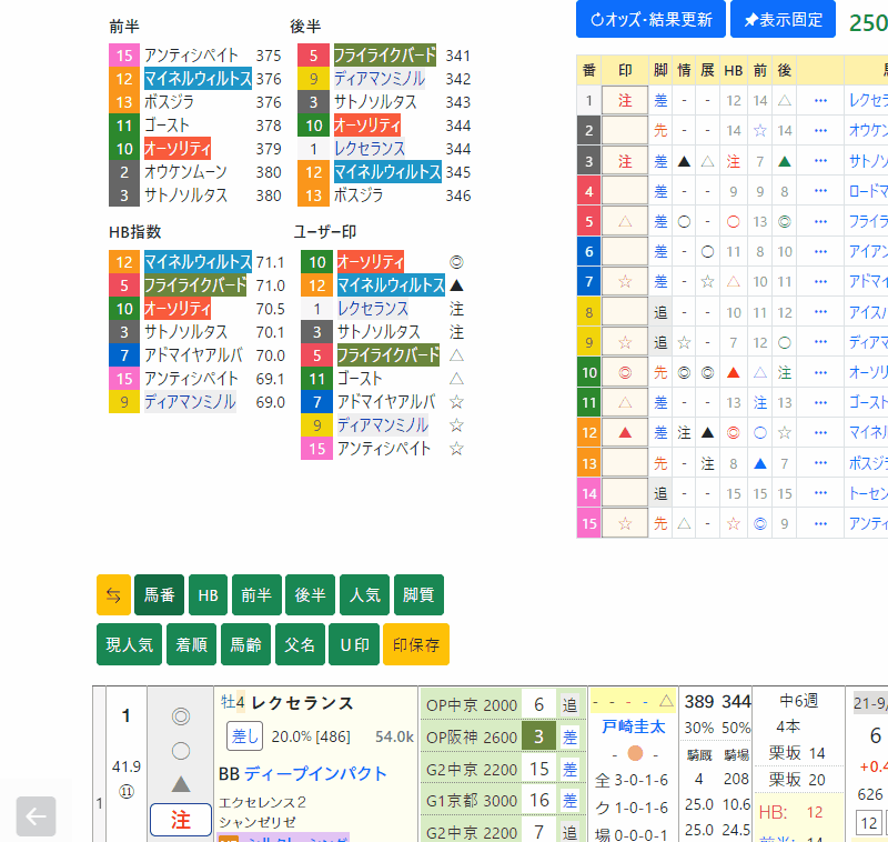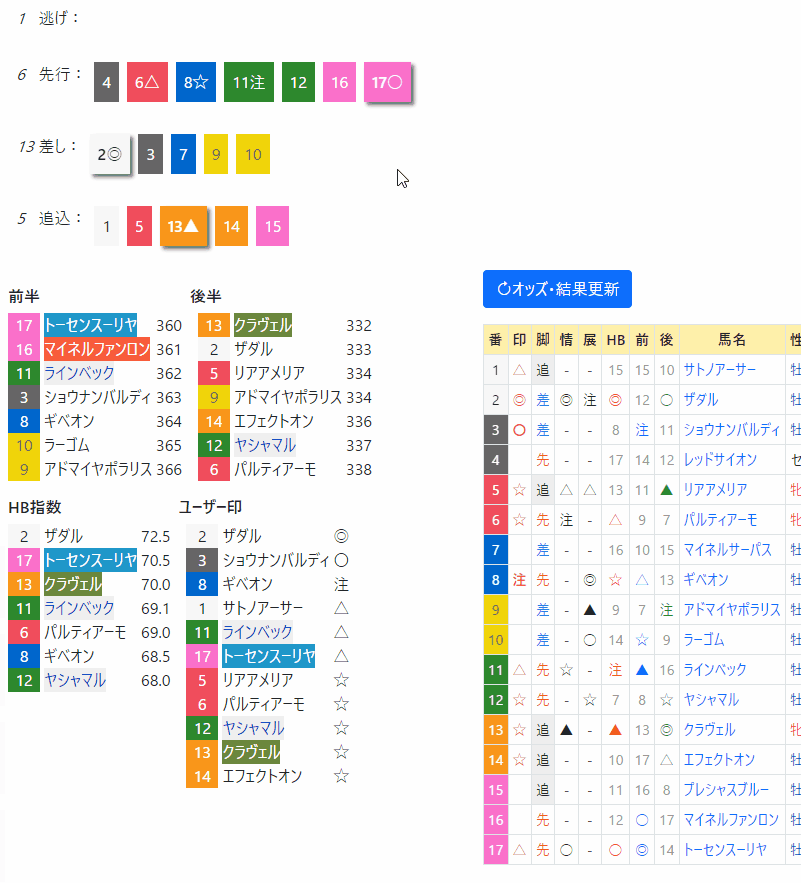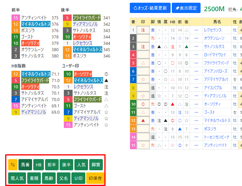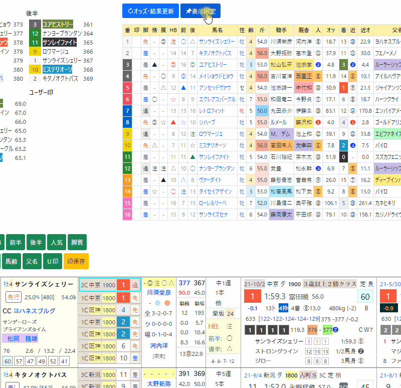 推定前半・後半3ハロン、ハイブリッド指数上位の7頭、ユーザー印を入れた馬を一覧で表示