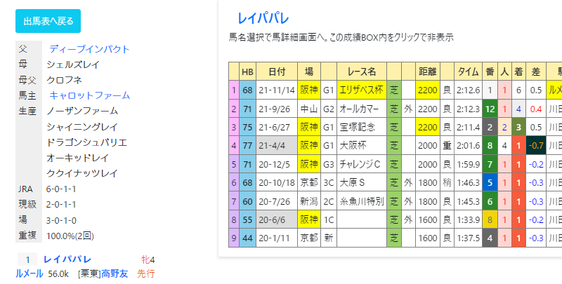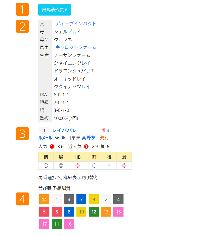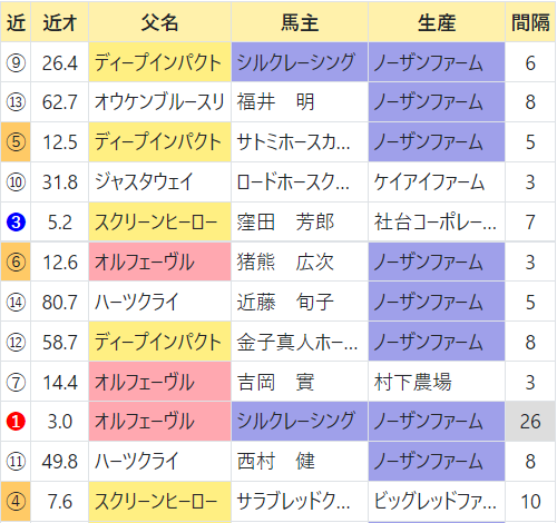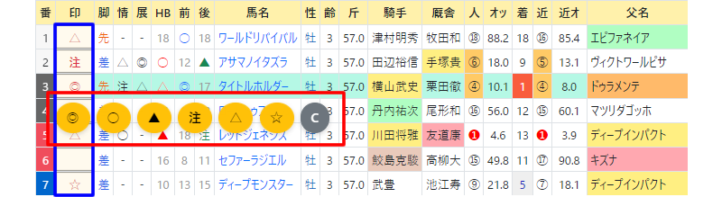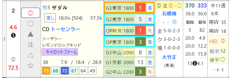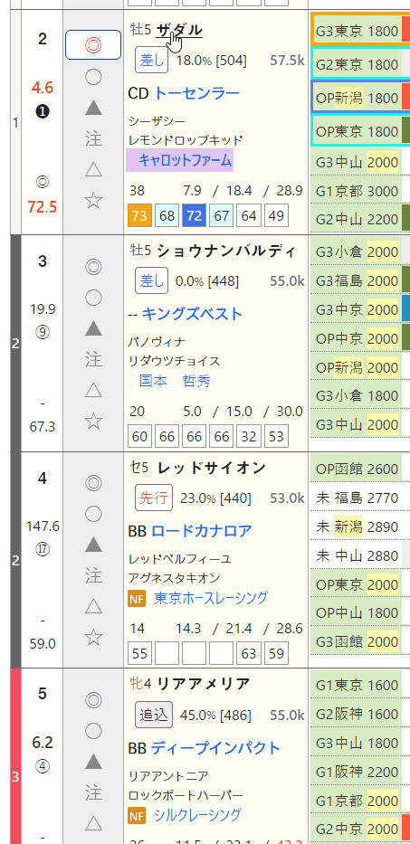 オレンジ・青・水色の枠は、全出走馬の過去4走位内の成績ハイブリッド指数の順位に対応