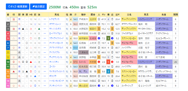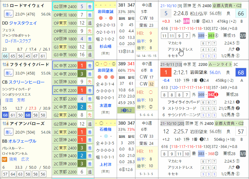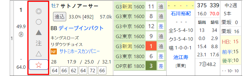 今走の各印と共に、過去走も画面内に収まりやすく一覧性で通常の馬柱よりも有意