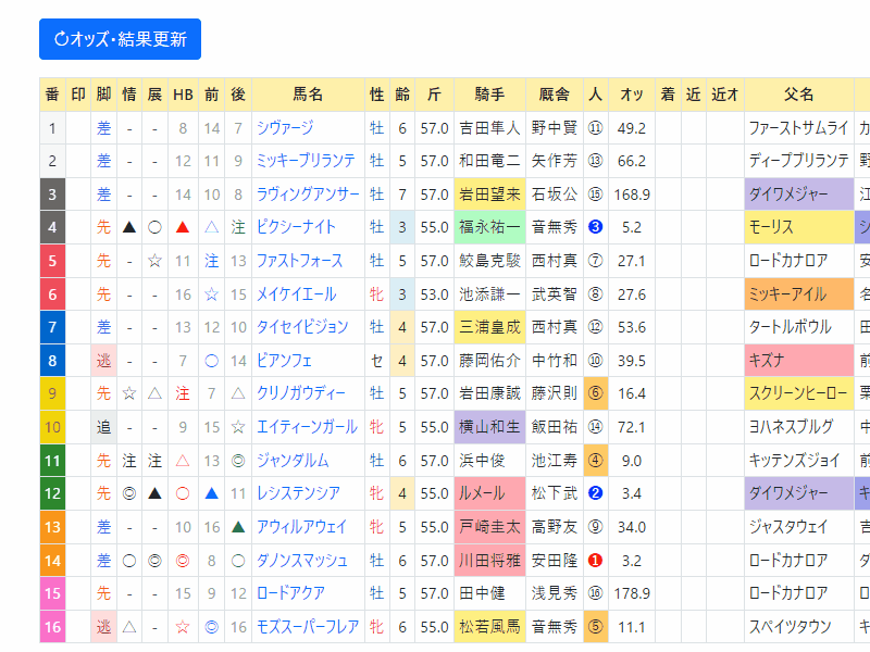 | 近オ | 直近オッズ | データ更新時の人気 確定後は最終人気 |
