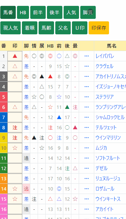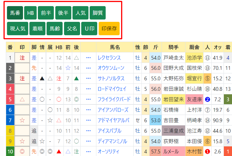 簡易版の出馬表であれば、例えばHB印順に並び替えを実行すると