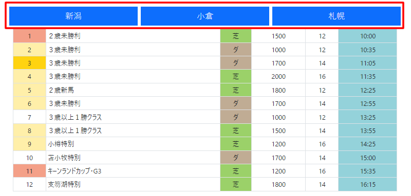 画面上部にある競馬場名のボタンで、その場のレース一覧を表示。