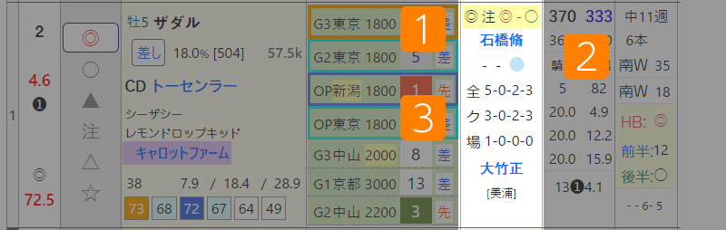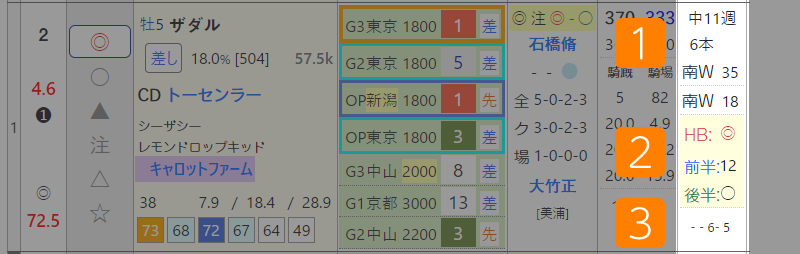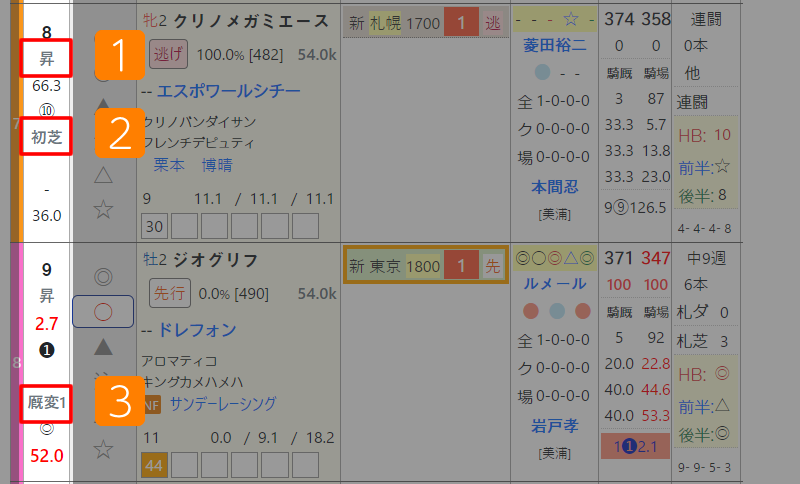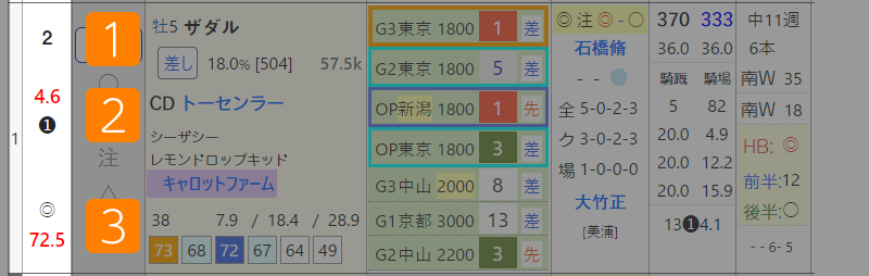 3「厩変」: 所属厩舎の変更、1が初戦で変更後3走目まで表示