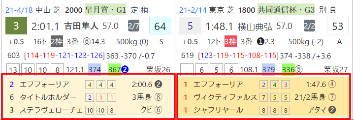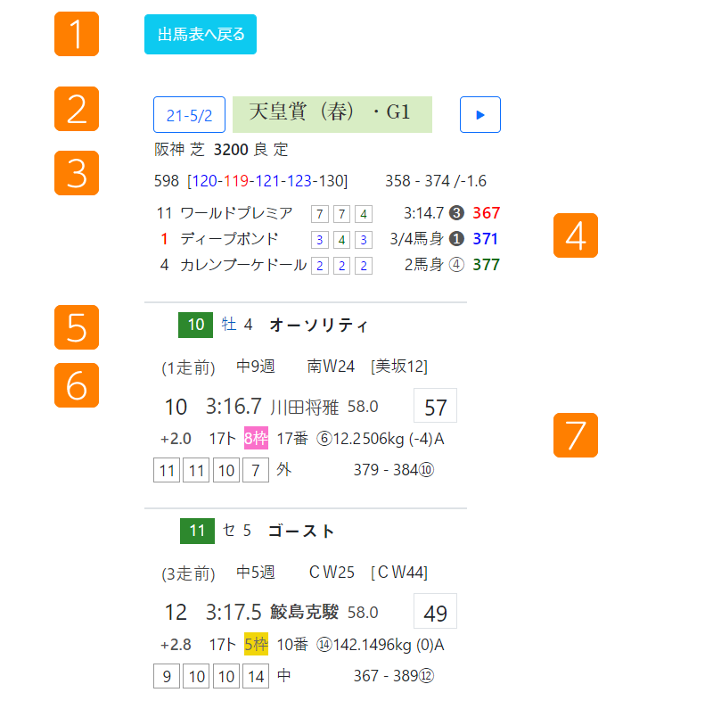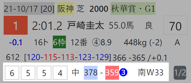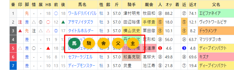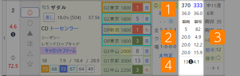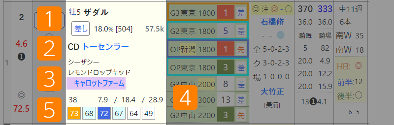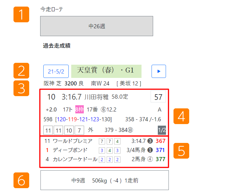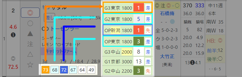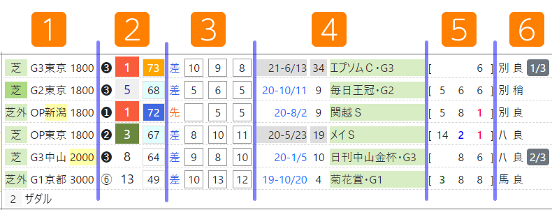 過去馬柱部分は、縦に6走を並べて最上位の段が最新の成績