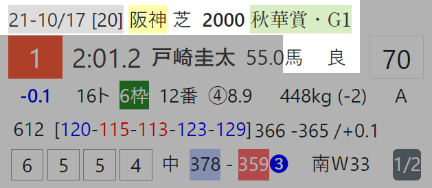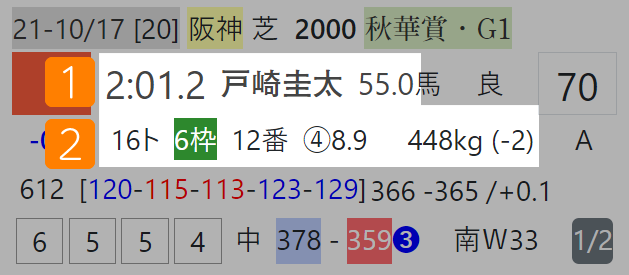 | 斤 | 斤量 | ハンデ戦は背景色が斤量によって変化 青:最軽量 水色:2番目に軽い ピンク:2番目に重い 赤:最も重い |