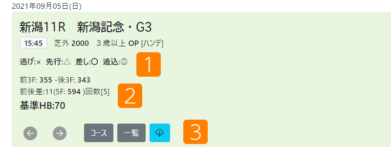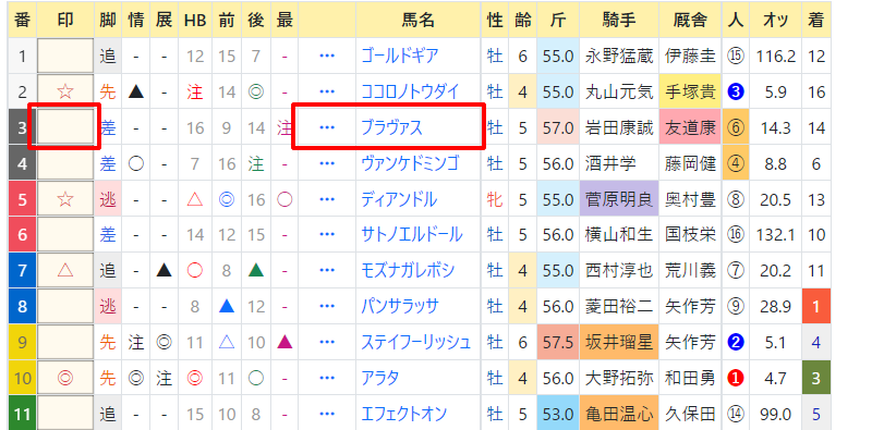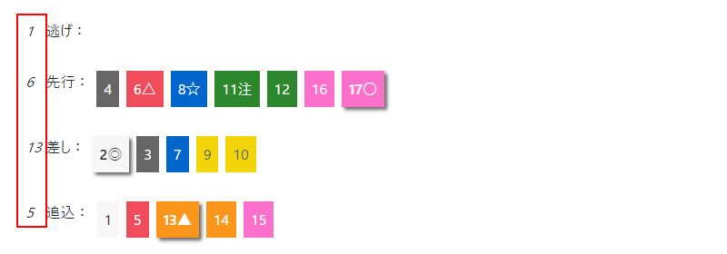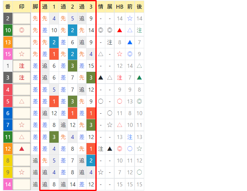 今回の予想脚質の右に、過去3走分の脚質と着順を表示