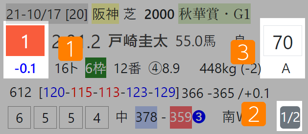 背景色は、後3F地点での先頭との差(後差)によって変化