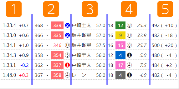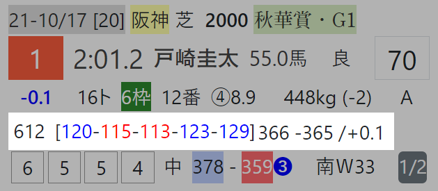 背景色は、「詰脚」(数値が高いほど直線で前との差を詰めた、マイナスの場合は更に直線で離された)によって変化
