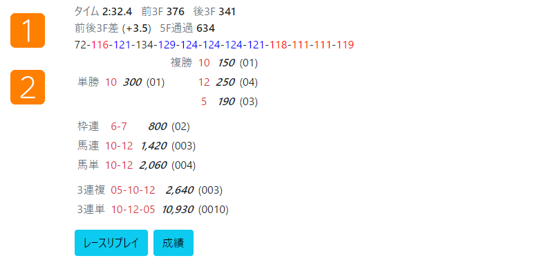 過去走のBOXを選択すると、成績データ、リプレイのリンクを表示