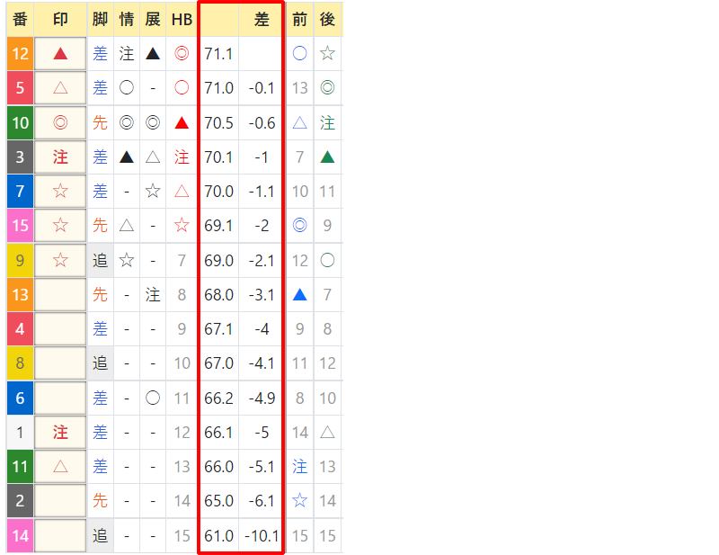 | 最 | 最高ハイブリッド指数印 | 出走馬の過去6走内で最も高いハイブリッド指数で比較した印 |