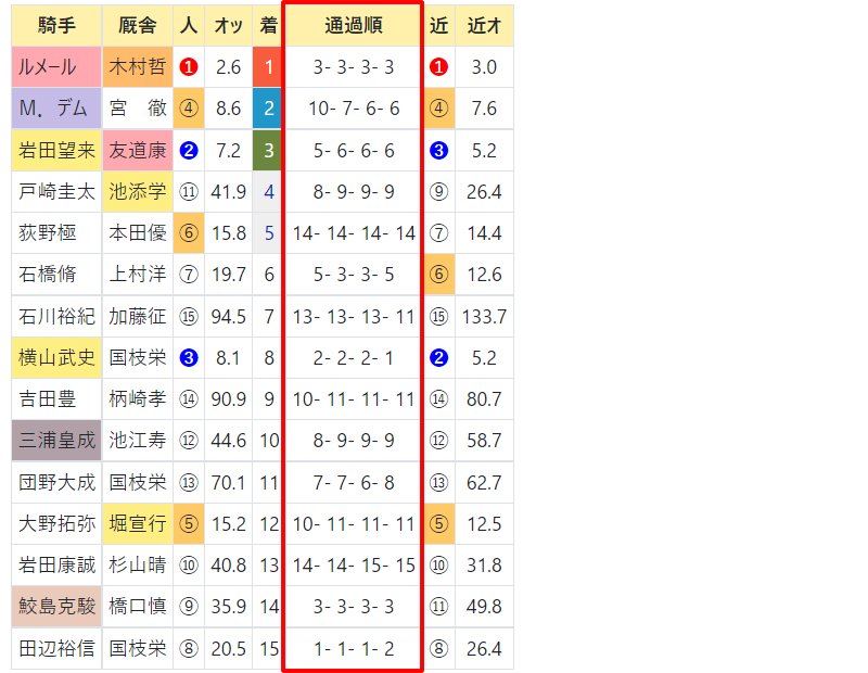 | 騎手 | 騎手名 | 背景色は詳細画面で設定したもの |